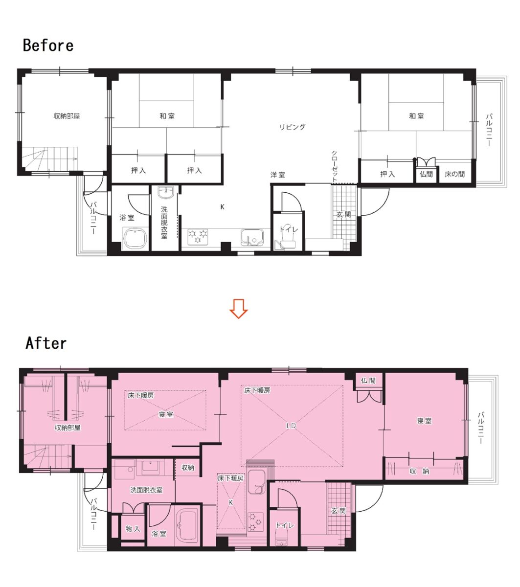 〈ご主人の寝室(手前)の壁を少し下げて拡張したリビング・ダイニングには、床暖房を入れてより快適にくつろげる空間に。窓には内窓を追加して断熱性を高めました〉