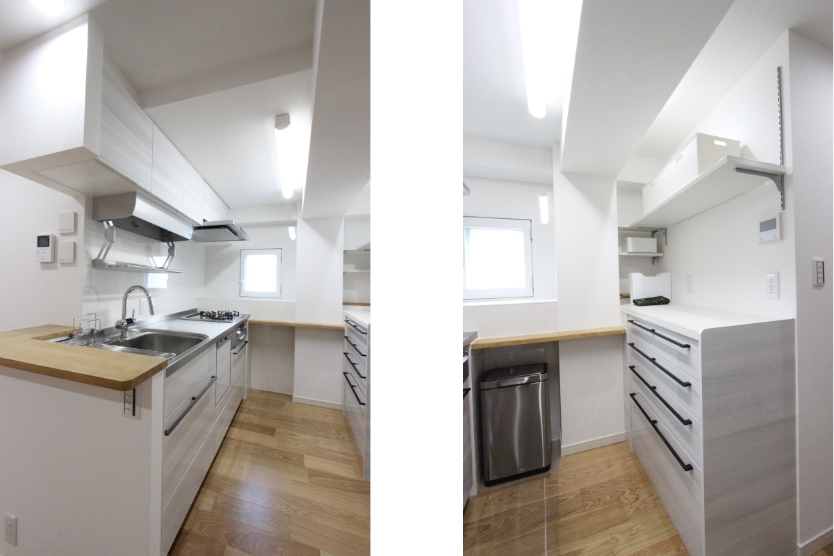 〈張り出したシンクを囲むように設置したL字型のカウンターは、幅を広めに取り、配膳や片付けにも活躍。柱や梁による壁や天井のデッドスペースも無駄なく収納に活用しました〉