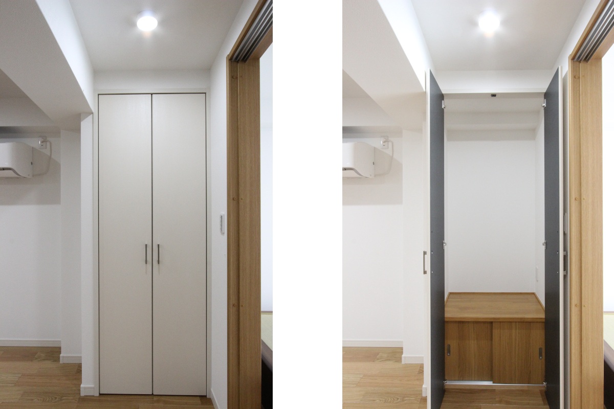 〈柱と梁の出っ張りと寝室の壁の間に仏間を設置。扉を閉めるとクローゼットのようにすっきり〉