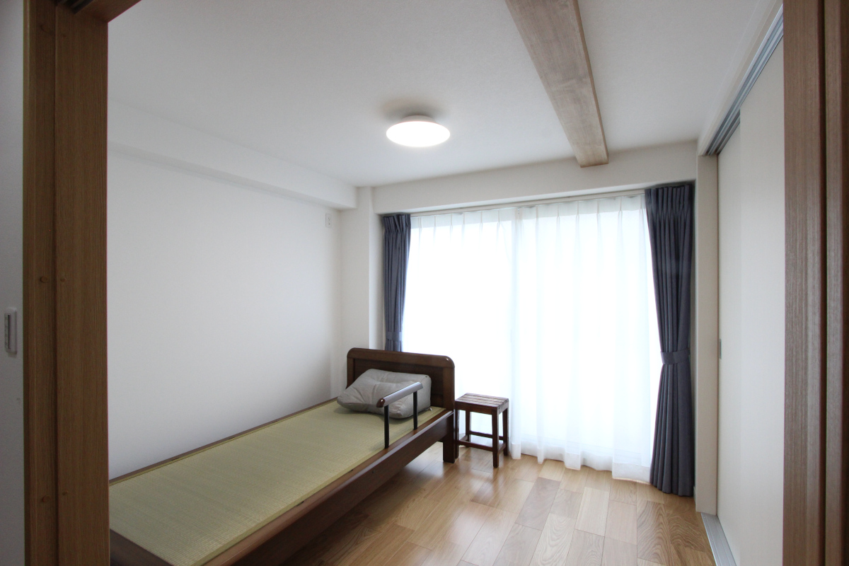 〈和室を洋室に変えたご主人の寝室。開閉が重くなっていた掃き出し窓は、歪みを調整してカバー工法で断熱サッシに入れ替え。床の間、仏間、押入れがあった壁側はクローゼットに変えました〉