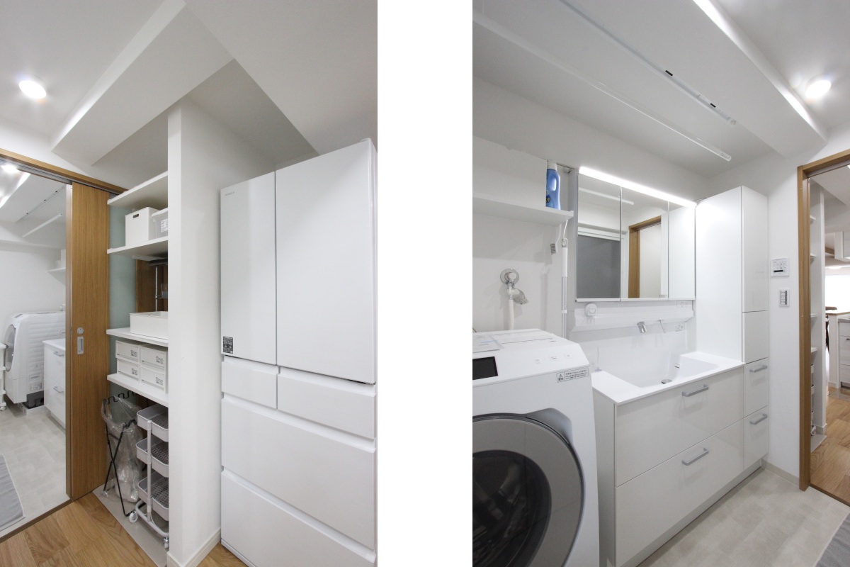 〈キッチンから洗面・脱衣・洗濯室につながり、勝手口に通り抜けできる家事効率の良い動線に〉