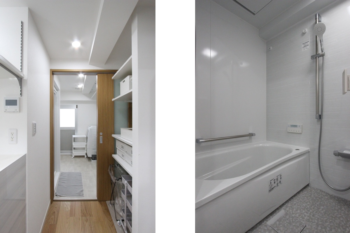 〈以前は中に勝手口があり、タイル貼りで寒かった浴室。勝手口から独立したシステムバスに変え、ゆったり入浴が楽しめる暖かいお風呂に〉