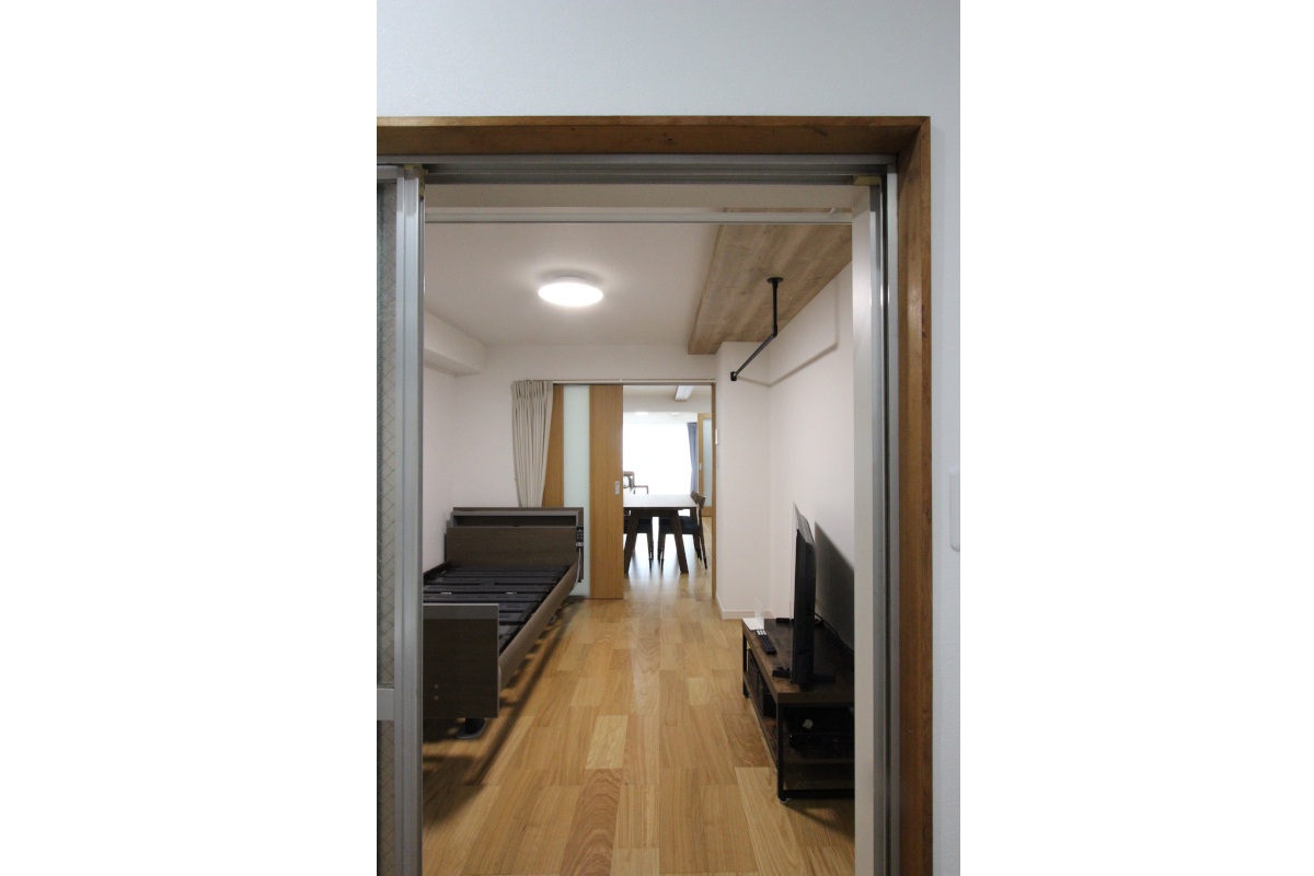 〈LDKから見たご主人の寝室。間仕切りを大きく開くガラス入りの引き戸にして、断熱サッシに変えた南面の大きな窓から部屋の奥まで光を取り込みます〉