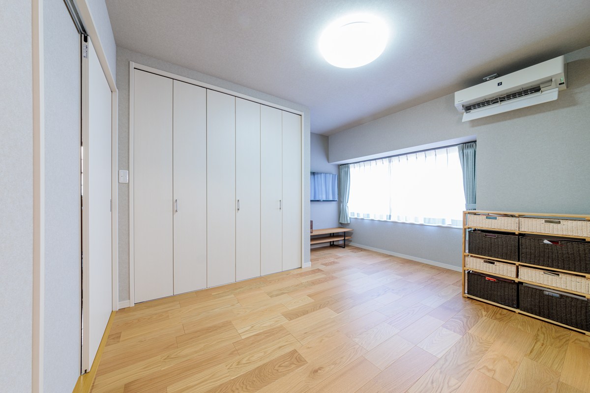 犬がいるため掃除しやすい床にしたいと相談したところ、フローリング調シートを提案してもらいました。見た目は木の床のようで、犬の脚が滑りにくく、汚れが水拭きできて、とても良いです。クロスも撥水タイプを提案してもらって、その中から家族みんなで選びました。床に敷居の凹凸があると犬が失敗した時の掃除が大変なので、間仕切りはレール不要の上吊り引き戸に。犬が破っていた内障子は無くしてカーテンに変更。犬の爪で傷だらけだったリビングドアも新しくして、部屋が見違えるほどきれいになった上に、犬と暮らす上でのストレスも解消しました。