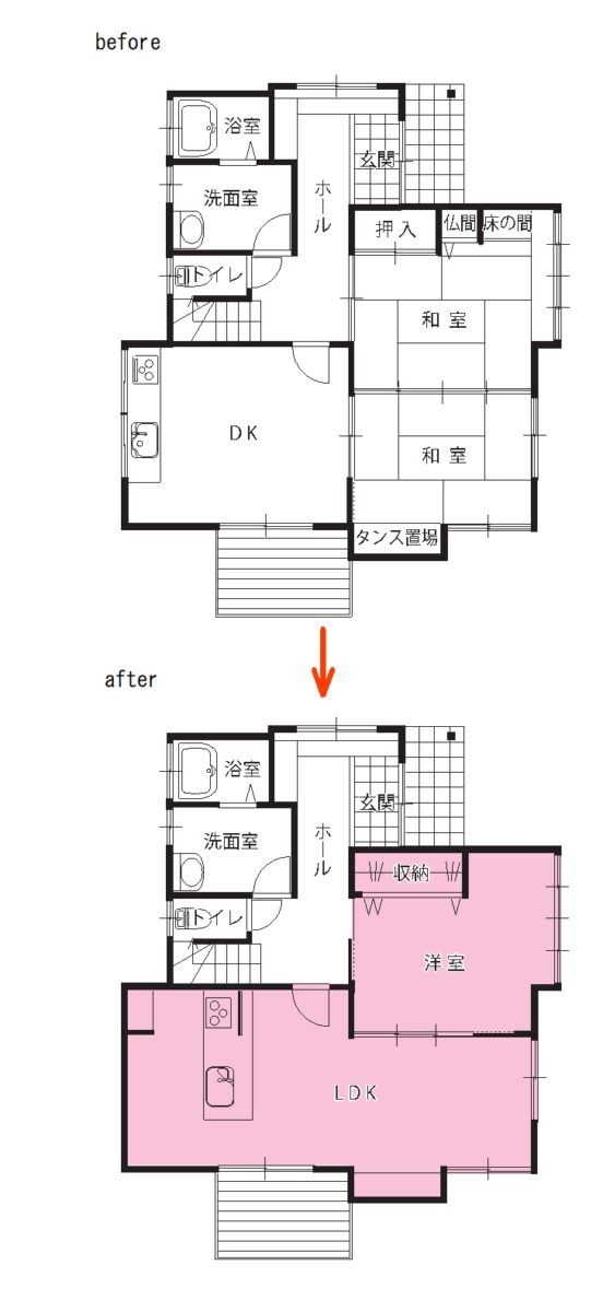まずは西日の入る窓に向かっていたキッチンを対面スタイルにすること。合わせて1階の2部屋の和室を洋室に変え、そのうち1部屋はLDKとつないで広い空間に、もう1部屋は母の寝室にしたいと相談しました。また和室はDK・ホールの床より15cmくらい段差があり、先々の転倒リスクも気になっていたのでフラットにすることもお願いしました。