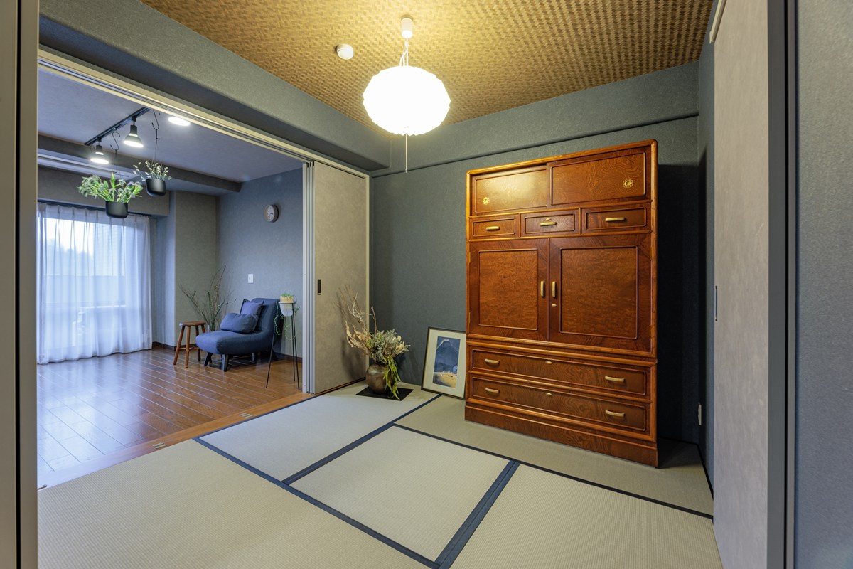 和室奥の入口がウォークスルークローゼットの入口。和室の建具は、壁の戸袋(写真左)にすっきり収まる3枚上吊り戸に