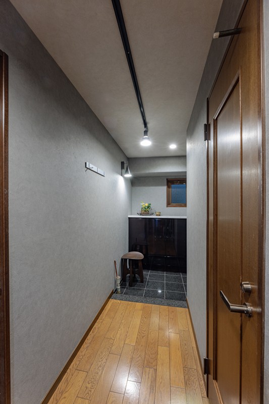 クロス交換のみ行った玄関には、少しだけ新しい工夫をプラス。ゲストのコート掛けに活躍するウォールフックと、真下に花を生けて楽しめるスポットライトを