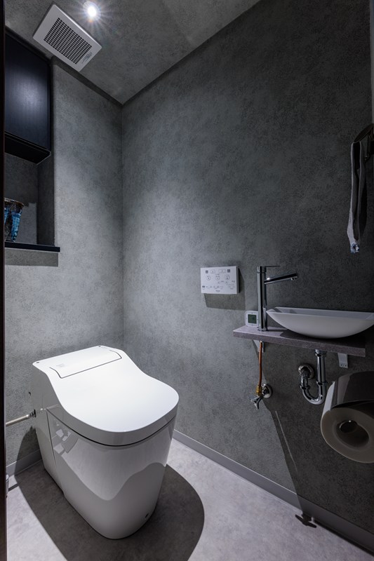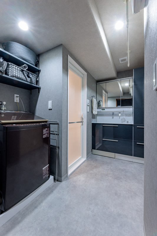収納力の高い洗面台に変更し、洗濯機スペースは扉を無くし、上部に棚を設置(左)。トイレは手洗いカウンターを造作し、ニッチ棚をダークカラーに変更