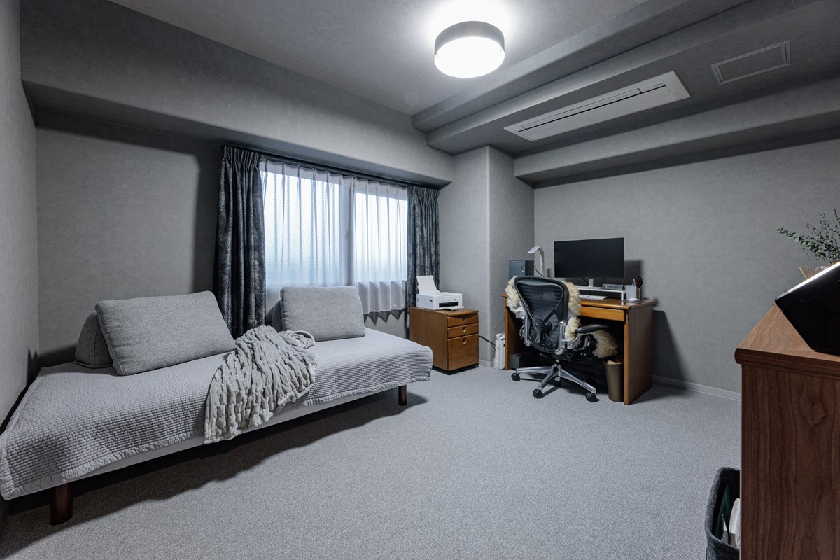 とにかくセンスのいい施主様のために、私たちができることを懸命に考えて取り組みました。一番苦労したのは、ビルトインエアコンの交換。玄関側の洋室は室外機を置くスペースがないため、天井にダクトを通し、マンションの住宅でも設置できるビルトインの機種を設置しました。少し天井が凸凹しましたが、喜んでいただけて良かったです。家具やインテリアが入るとますます素敵な空間になっていて、取材に伺った女性スタッフみんなで「こんな部屋に住みたい!」とうっとりしました。