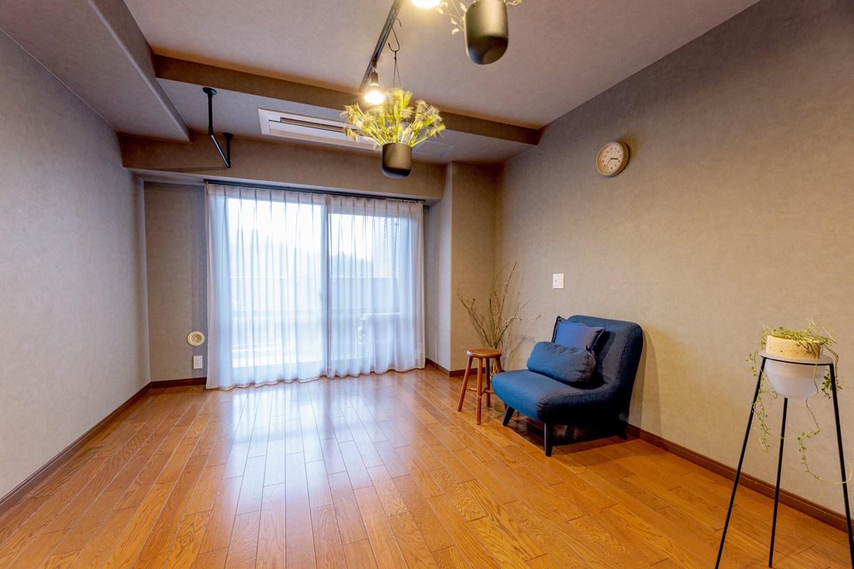 既存のまま利用した床や建具と馴染むようにまとめた落ち着いた空間。天井には植物なども掛けられるライティングレールを設置