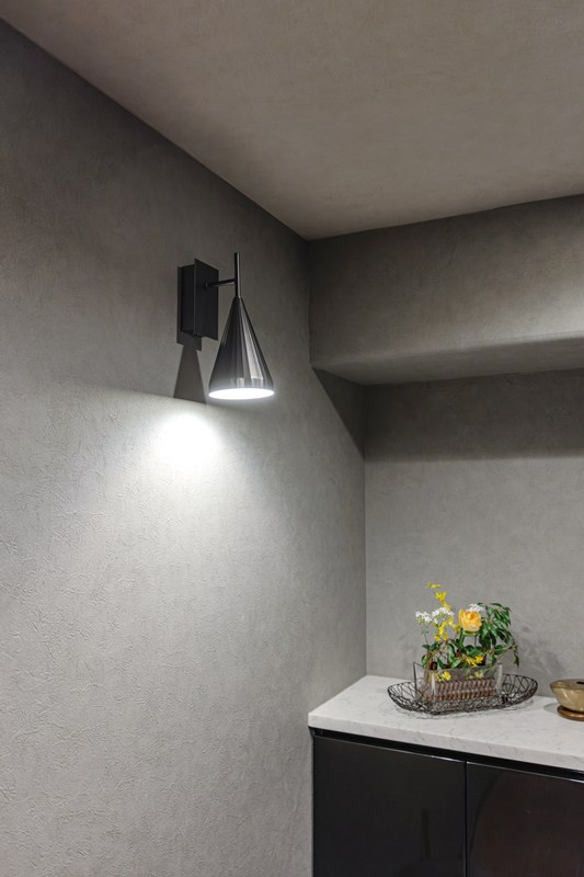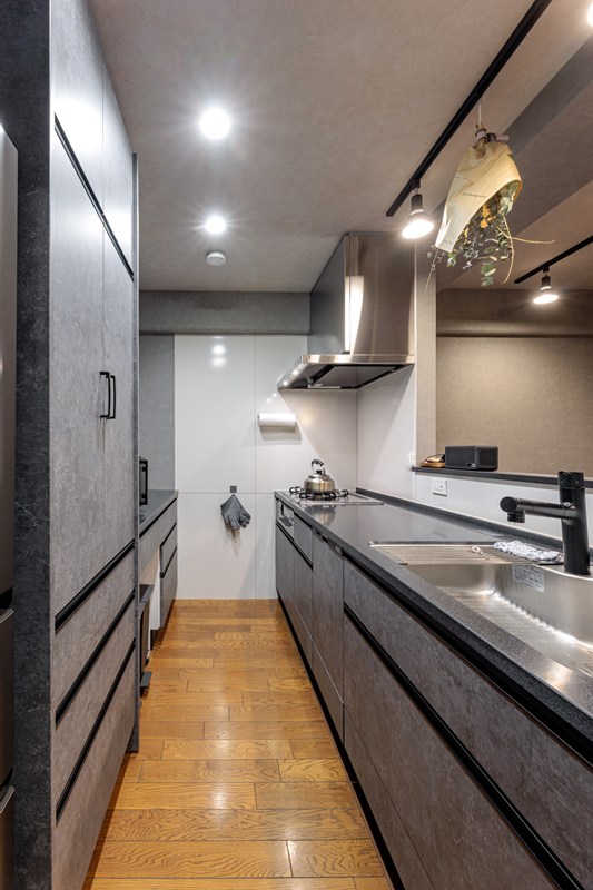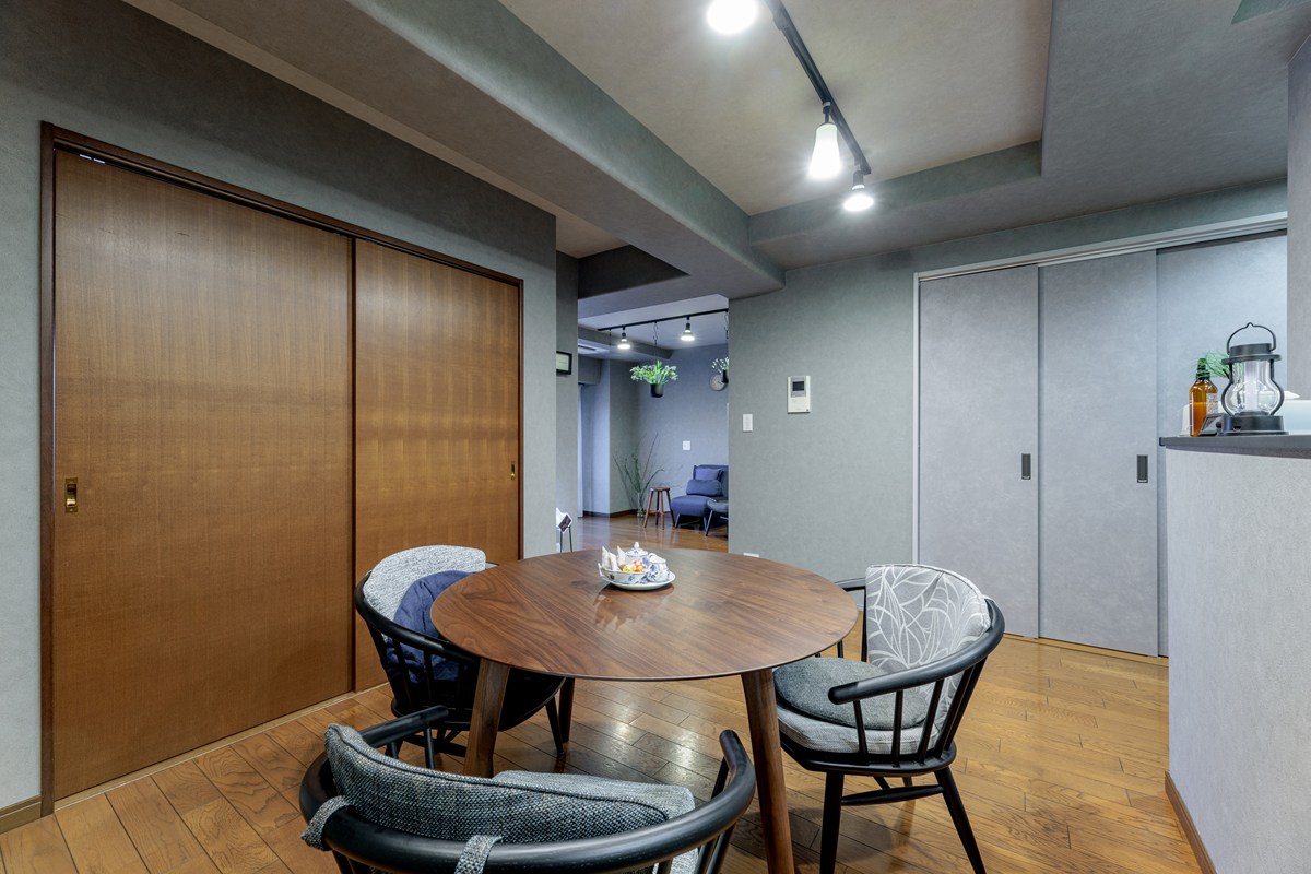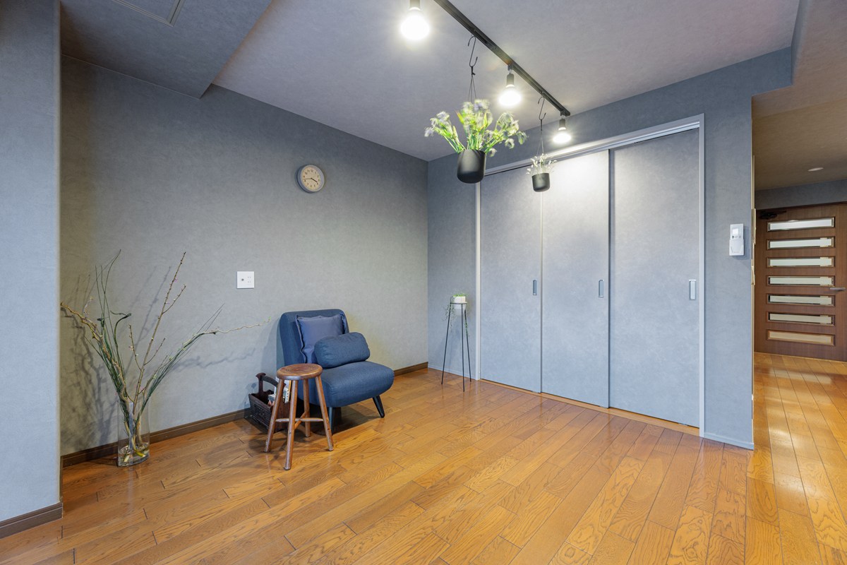 ここで育った娘たちが「思い出を残したい」と言っていたので、床は既存のまま活かし、それに調和する落ち着いた空間を目指しました。天井の凹凸を活かすため、コーディネーターさんと相談して、梁の部分をあえて壁と同じ濃いめのグレーに。天井の薄いグレーとのコントラストで、空間に心地よいメリハリが生まれました。また、植物などを吊るして楽しみたかったので、照明にはライティングレールを多用しています。