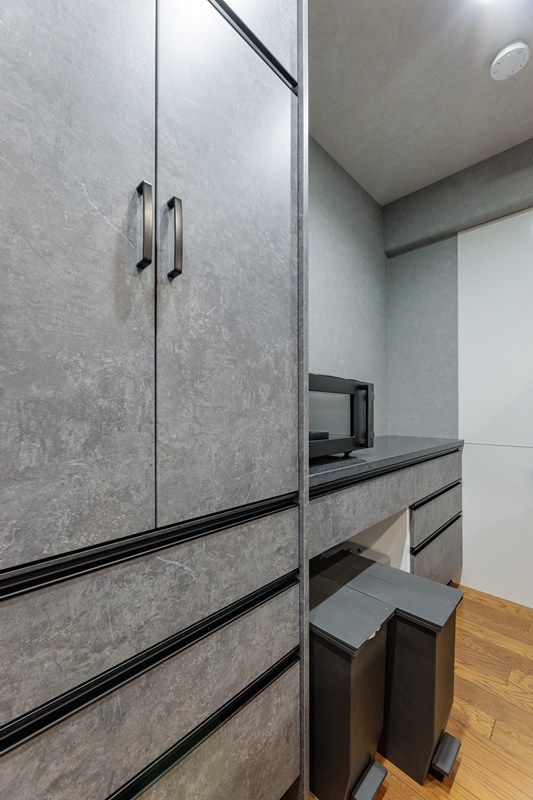 トールキャビネットは、上部の掃除の手間や地震時の転倒リスクのない天井付けに。カウンター下部のゴミ箱スペースが施主様のお気に入り