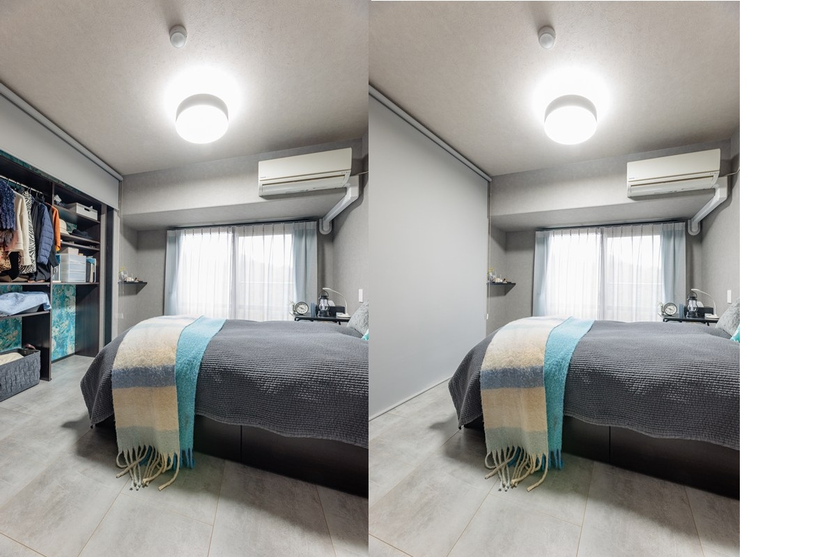 寝室のクローゼットは扉を無くし、オープンタイプにして華やかなクロスを採用。必要に応じて目隠しできるロールスクリーンを設置しました